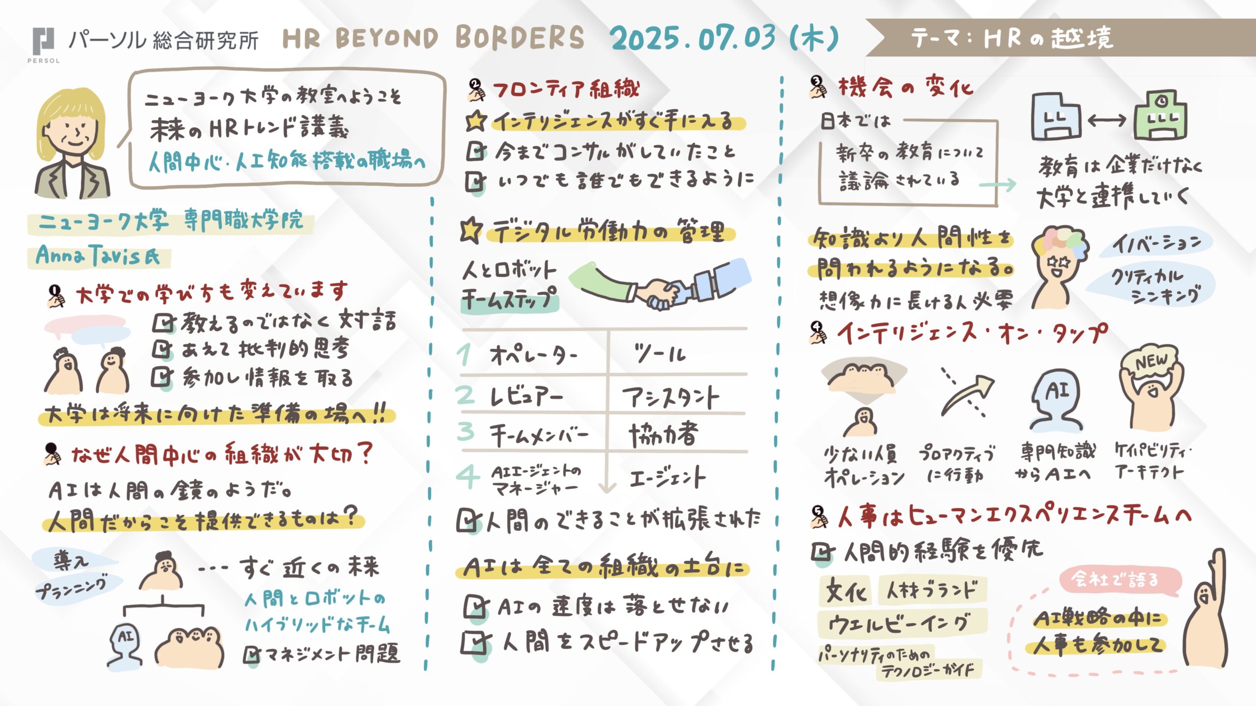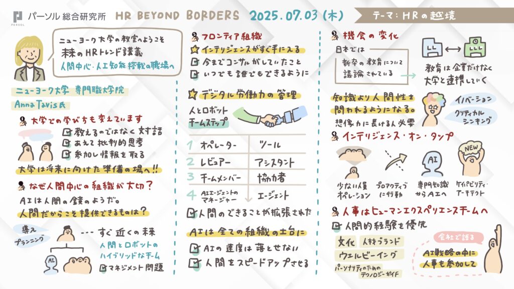 2025年7月3日(木)に開催されたHR Beyond Bordersの最終日(3日目)には、AI時代における人間中心の働き方や学びの再設計をテーマに、ニューヨーク大学で教鞭を執るAnna Tavis(アナ・テイビス)氏にご講演いただいた。テイビス氏はAIの進化が進む現在、授業の進め方を抜本的に変革し、学生が主体的に対話し、互いに挑戦し合う「cross-training(クロストレーニング)」を重視した教育を実践している。これは、AIやYouTubeで情報が簡単に手に入る時代において、授業の役割は知識の伝達ではなく「考える力」を養うことにあるという確信に基づいている。