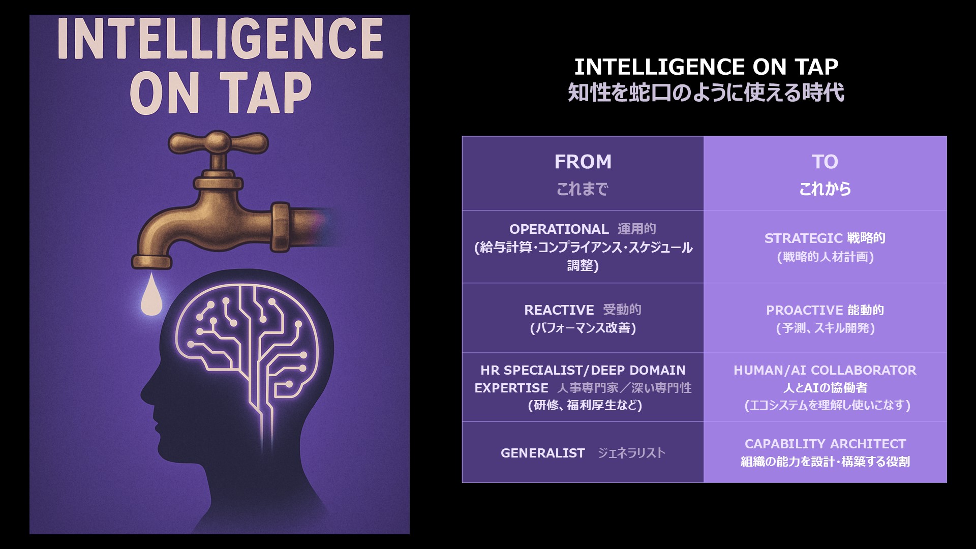 特に、AI戦略の議論においてはHRが必ず席に着き、人間中心の視点から組織変革をリードすることが求められると強調された。技術スキルがAIに取って代わられる時代だからこそ、人間らしい共感力や創造性など人間の「uniqueness(独自性)」が重要になる。テイビス氏は「When your technical skills are eclipsed, your humanity will matter more than ever(あなたの技術スキルがかすんでしまうとき、あなたの人間性がこれまで以上に重要になる) 」と述べ、HR部門が従業員の人間性を伸ばす施策を重視すべきことを示している。