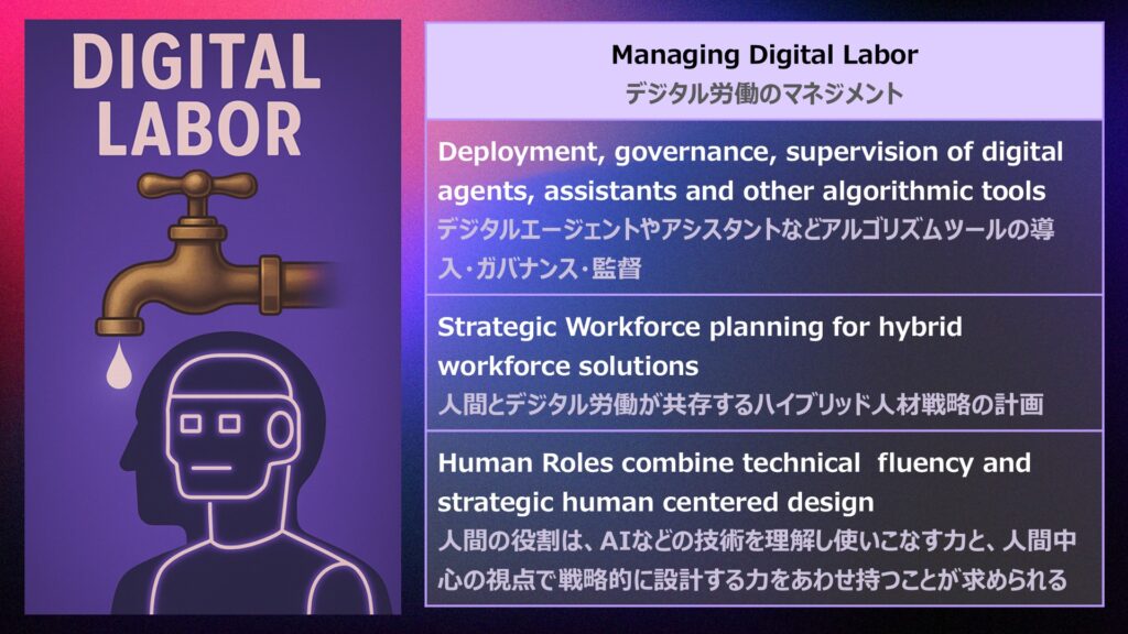 次に「digital labor(デジタル労働)」は、AIエージェントが人間に代わって一部の業務を担当することを意味する。マネジャーは人間とAIの成果をどう評価し、仕事を設計するかという新たな課題に直面している。