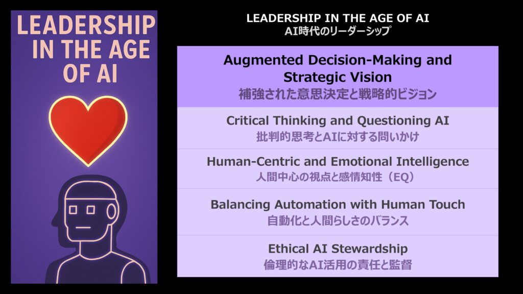 そして、AI時代におけるリーダーシップの再定義も必要であり、感情的知性やカリスマ性、コミュニケーションスキルといった従来のリーダーシップ要素がどう変化するのかが問われている。