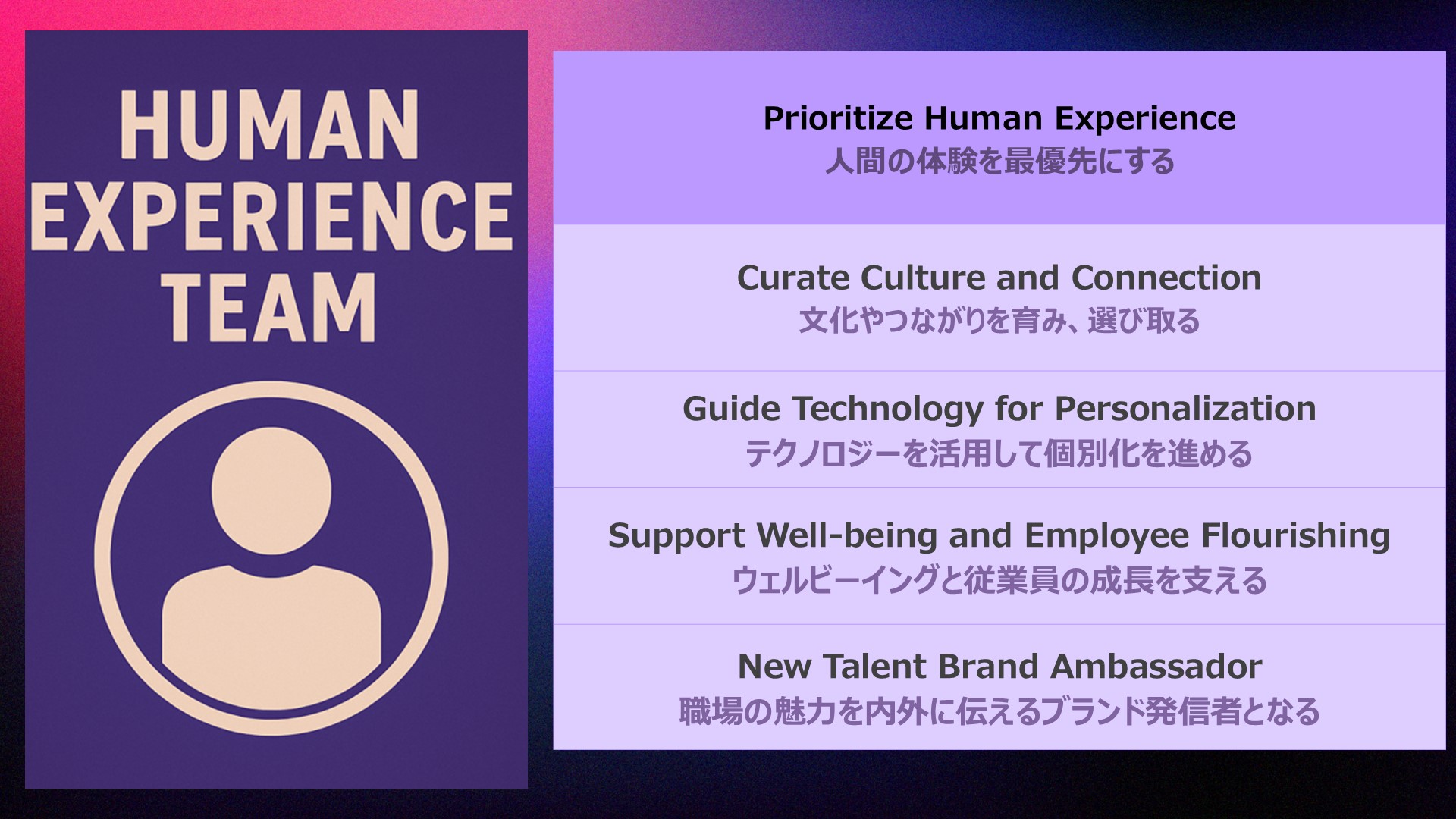 最後に、人事部門の役割に関する重要な提言があった。テイビス氏は「Human Resource Management」を「Human Experience Team(人間体験チーム)」と呼び変えることを提唱している。これは、人間を単なる資源としてではなく、職場における体験全体を重視するという発想である。人材データを解釈し経営層に伝える「data storyteller(データストーリーテラー)」としての役割を担いながら、従業員のウェルビーイングと心理的安全性を包括的にサポートする仕組みを作ることが使命となるチームへの進化が必要だと述べた。
