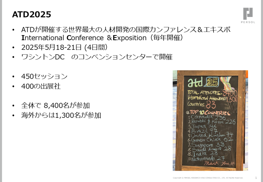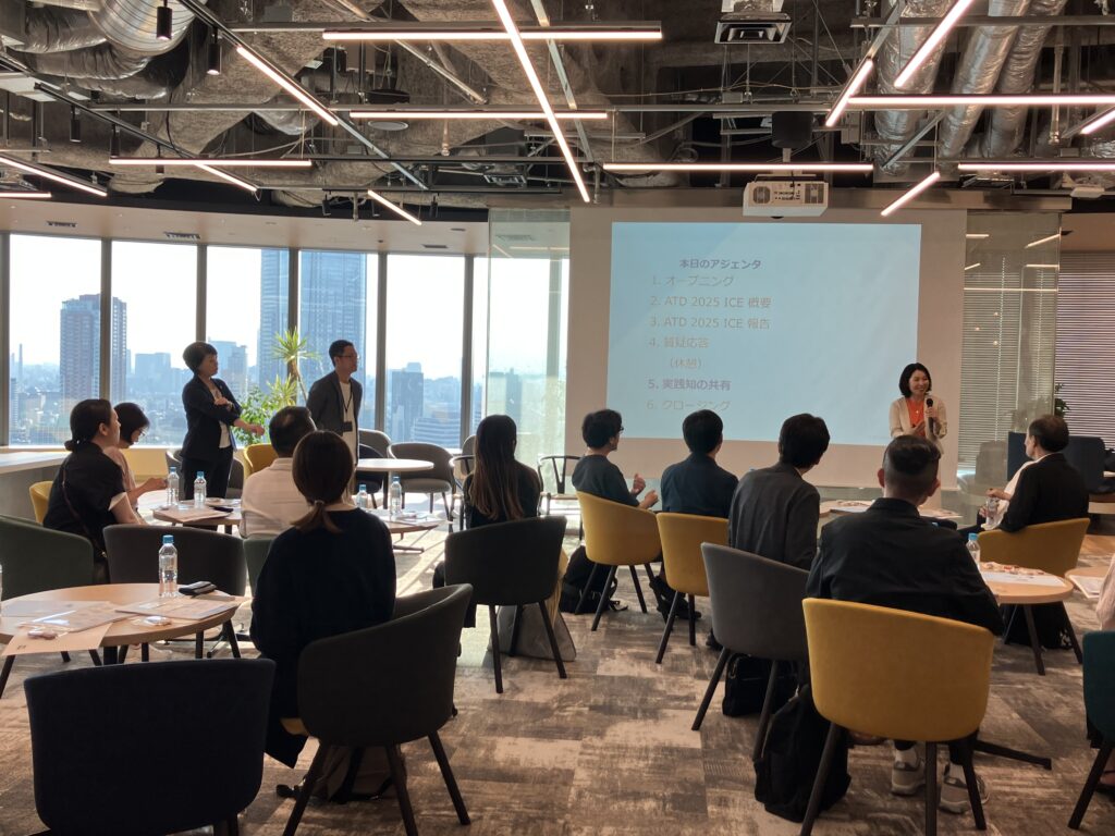 ATD認定プログラム修了者や関係者が集い、2025年5月にワシントンD.C.で開催された「ATD ICE(International Conference & Exposition)」の現地レポートや、認定プログラム以降の実践の中での学びの共有を行いました。今回はパーソル総合研究所から現地参加したメンバーと中原 孝子氏が、会場の雰囲気や注目セッションの内容、実務への示唆などを報告。参加者同士の対話を交えながら、未来の人材開発・組織開発のヒントが共有されました。