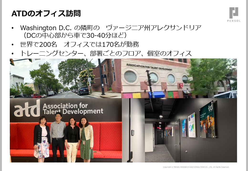 またATDのグローバルパートナーとして、ATD本部オフィス(バージニア州アレクサンドリア)への訪問も実施しました(図2)。各国からのパートナーとの交流や研修施設の見学を通じて、グローバルな運営体制を体感する貴重な機会になりました。