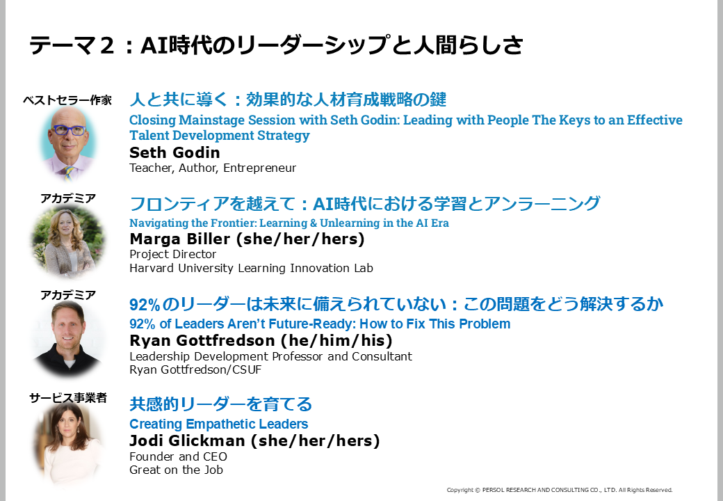 また、ベストセラー作家のセス・ゴーディン氏は「人はリソースではない。最高の仕事とは、信頼され、期待されていると感じる中でこそ生まれる」と語り、HR=ヒューマンリソースではなく、才能ある人間として扱うべきだと提言し、人材の捉え方を根本から問い直すものでした。