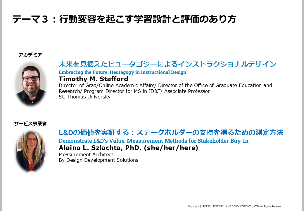 さらに、サービス事業者のアライナ氏のセッションでは、「L&Dの価値は証明するものではなく、共に気づくもの」とされていたのが印象的でした。ROI(投資対効果)については「定量的に“証明する”ことではなく、組織の目的や戦略とのつながりの中で“どのような意味があるのか”を共に見出すことが重要」であり、学びが事業にどうインパクトを与えるのかを“翻訳”できる人材がますます求められていると語られました。データと物語の両方を使いながら、経営に寄与する“翻訳者”としてのL&Dの役割の重要性が強調されました。