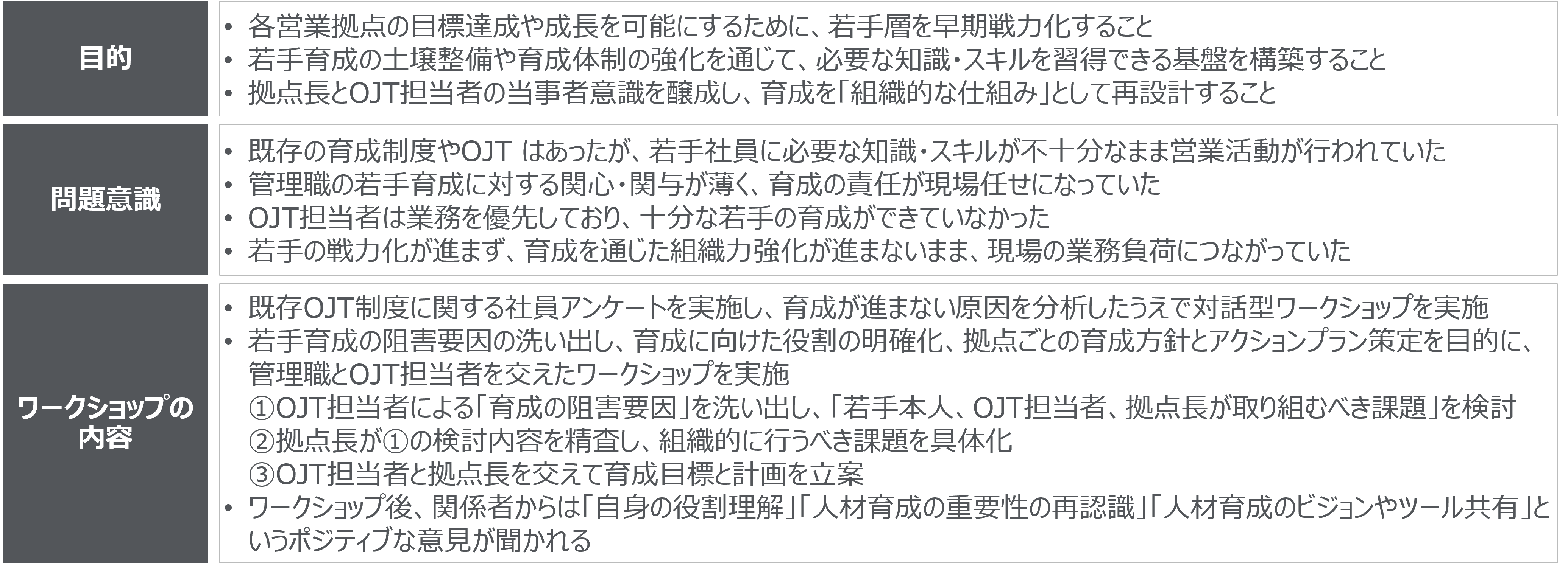 この取組みでは、既存のOJT制度のアンケート分析からスタートし、ワークショップでは、育成を阻害する要因の洗い出し → 拠点長・OJT担当者が担う役割の明確化 → 拠点長・OJT担当者を交えて育成目標と行動計画の策定を行った。ワークショップ後には、関係者からは「自身の役割理解」「人材育成の重要性の再認識」「人材育成のビジョンやツール共有」というポジティブな意見が聞かれている。