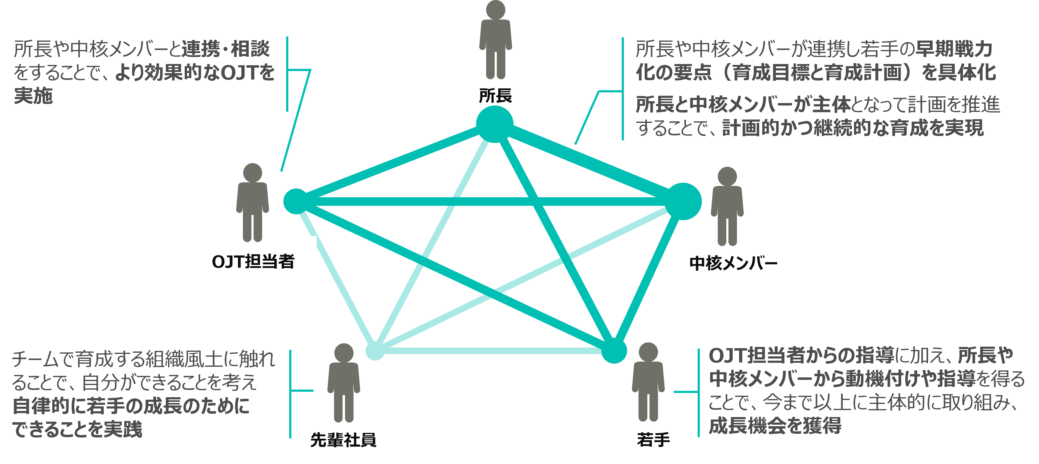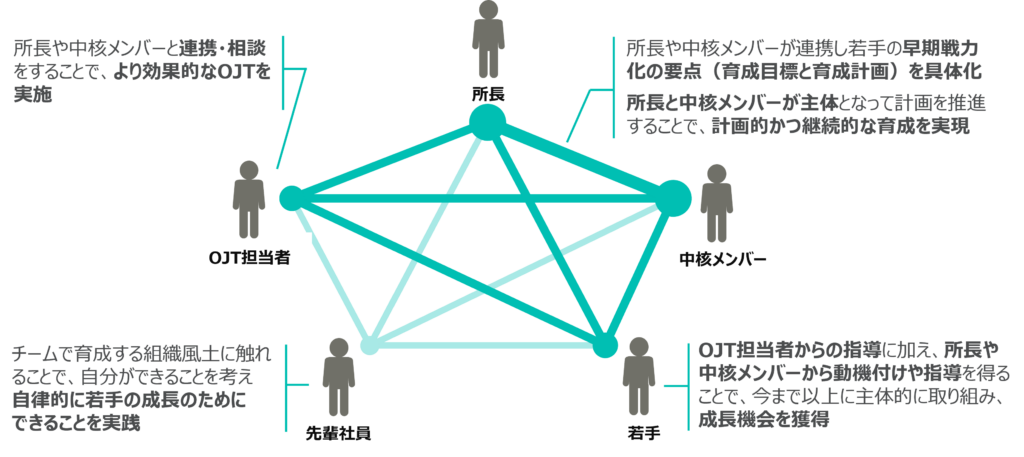 この事例では、関係者間で「共通目標や役割」を共有することと、人材育成が継続的に行われる「仕組みを整えること」の両面に取り組むことで、個人の育成だけで終わらせず、組織内で個人を活かすことの実効性を高めている。また、「対話」を通じて関係者の当事者意識を醸成し、育成に関する協働体制を構築することも、「組織で活用できる人的資本」に転換するカギであることを示している。