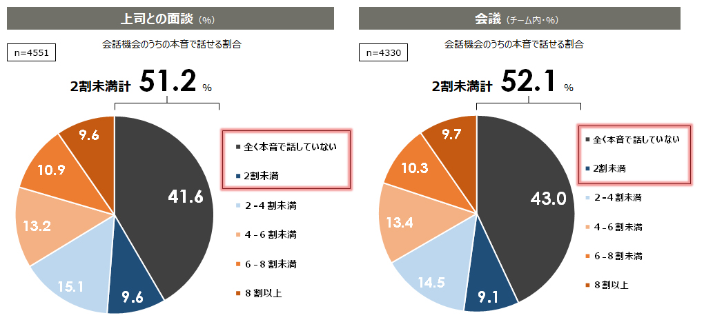 まず、働く個人に対して職場内コミュニケーションの実態を確認したところ、職場での会話機会のうち「本音で話せている」割合は、上司との面談で51.2%、チーム内の会議で52.1%が2割未満にとどまり(図3)、本質的な対話が行われていないことがわかる。