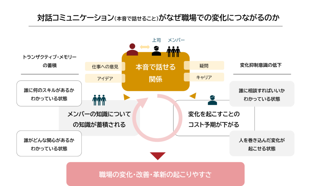 調査結果から明らかになったことは、職場での「対話」が個人の成長だけでなく、次の3つの観点から、組織力の向上にも寄与する可能性が高いという点である。