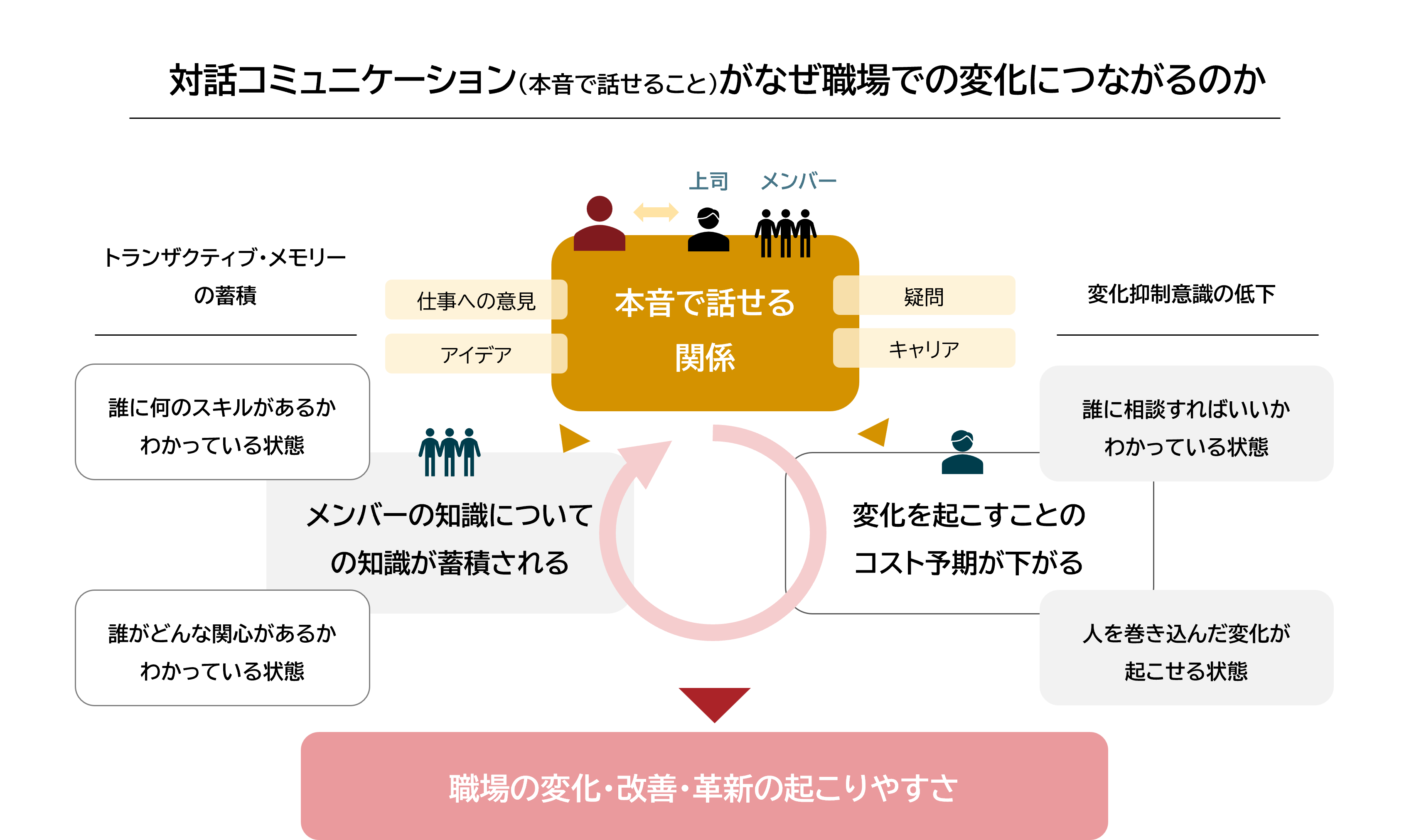 とりわけ、「対話」の不足は、個人の人的資本が組織内で相互作用するプロセスを阻害する要因となる。そのため、企業が取り組むべきは、対話の場を設定することにより、