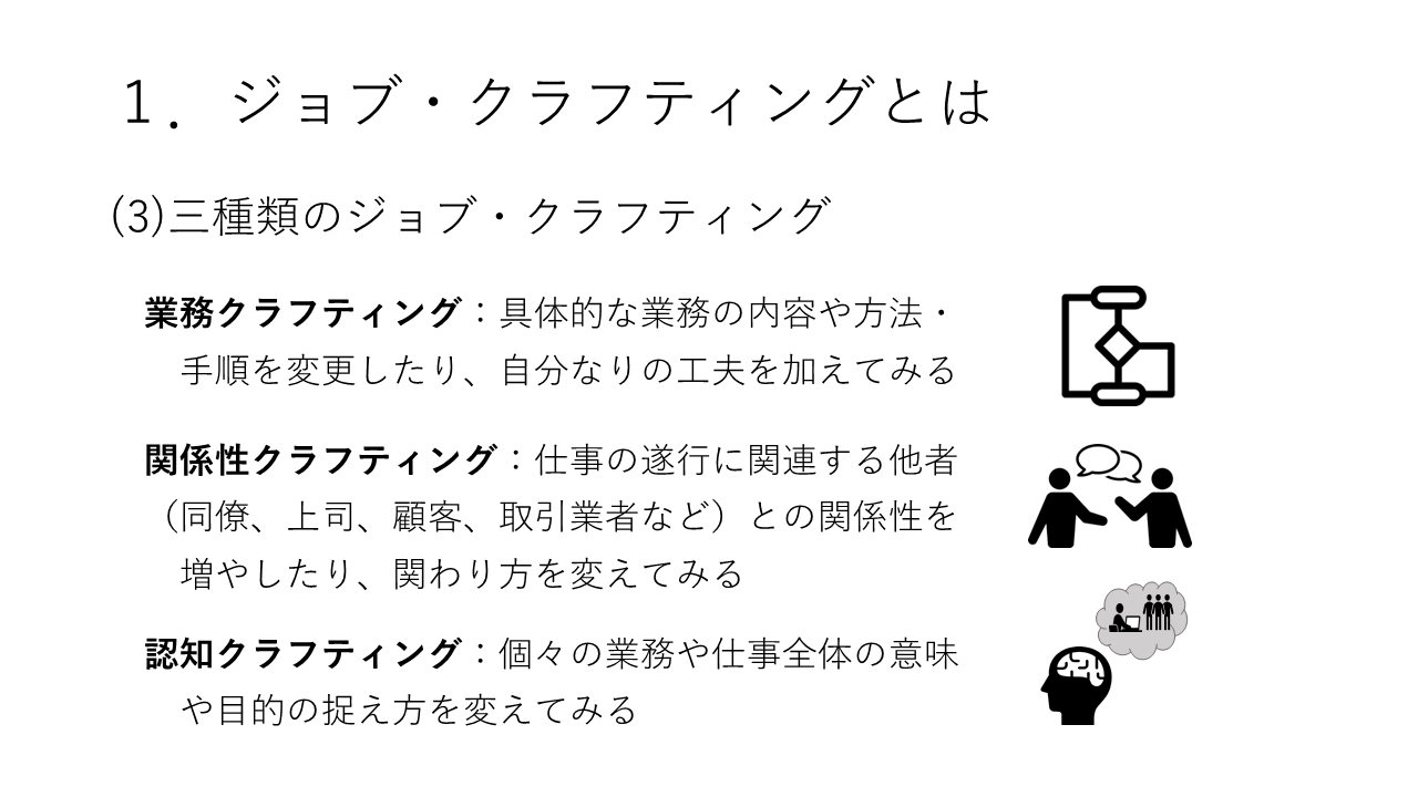 ジョブ・クラフティングには、仕事そのものに変化を加えたり、手順を変えるなどの工夫をしたりする「業務クラフティング」、仕事との関係や人との関係性を変えてみる「関係性クラフティング」、自分にとっての仕事の意味・目的を捉え直す「認知クラフティング」の3つの種類があり、連続性をもってつながり合っている(図1)。