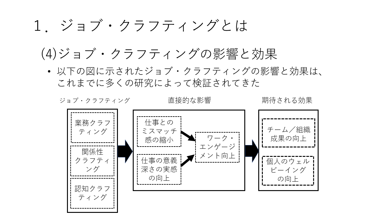「今の仕事」という足元を見て仕事との向き合い方を変えていくのがジョブ・クラフティングですので、そこから長期的なキャリアを考えるのが難しい、というのは確かにその通りだと思います。長期的なビジョンを考えて、そこから今の仕事をどうするのか、その一方で今の仕事から考えて長期的にどうしたいのか、長期と短期の両面から現実的なキャリアの歩みを作っていけるように、長期的なキャリアビジョンづくりの支援も同時に行っていくとよいと思います。