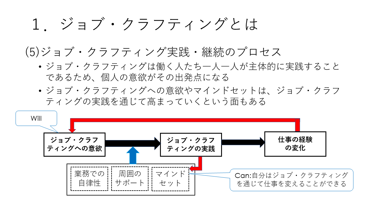 「与えられた職務(MUST)というものがあり、それをやらなければいけないときに、自分の意志(WILL)や能力(CAN)を“ひと匙”加味する。それによって仕事の手触り感が変わり、自分にとっての仕事の意味合いや経験が変わっていく。これがジョブ・クラフティングであると理解していただくとよいでしょう」(高尾氏)