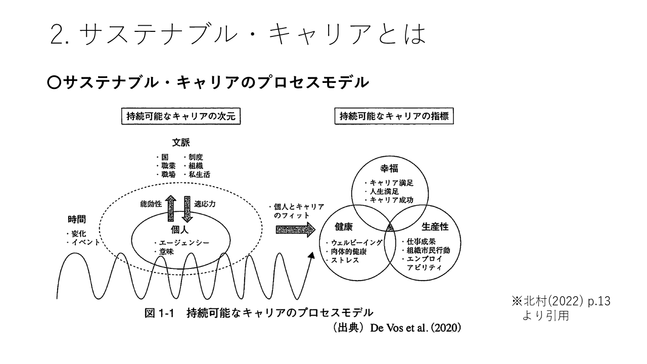 サステナブル・キャリアは、「時間の経過」とともに「文脈(環境や状況)」も「個人」も変化していくことを前提としている。また、個人の主体性を中心にしつつも、「キャリアをこんなふうに進めていこう」という単純な主体性ではなく、変化する文脈との相互作用の中で、いかに主体性を発揮し、自分の仕事をどう意味づけていくか、というのがこの概念の特徴だ。ここでいう「文脈」には「組織」や「職場」も含まれ、 組織や職場が個人がサステナブル・キャリアを実現するための支援者・パートナーになり得る。またサステナブル・キャリアは、「幸福」や「健康」とともに、仕事の成果、組織市民行動、そしてエンプロイアビリティを生み出すという意味での「生産性」を指標として重視していて、この点が「キャリア自律」の考え方をより洗練させた要素になっている。