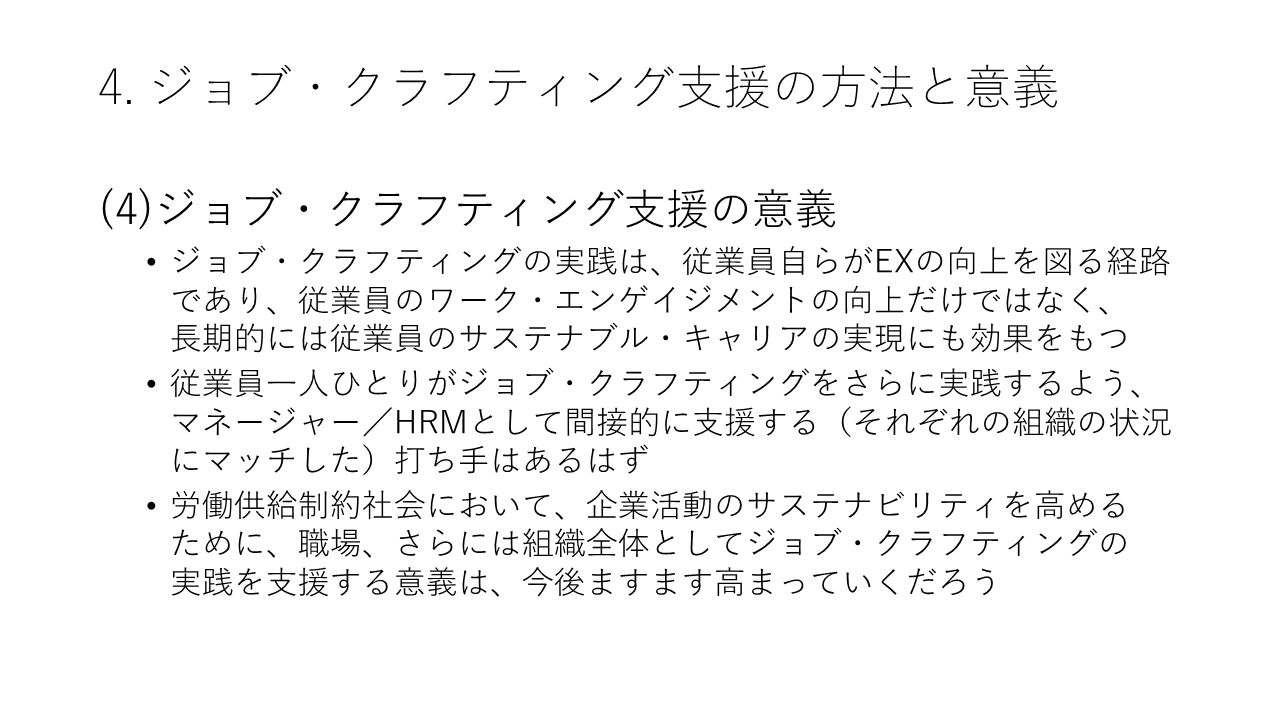 組織全体としてジョブ・クラフティングの実践を支援することは、ミドル・シニア層の活性化と活躍にもつながる。人手不足という労働供給制約社会の中で、企業の活動自体のサステナビリティを高めていく意味でも、ジョブ・クラフティング支援は今後ますます重要になっていくだろう。