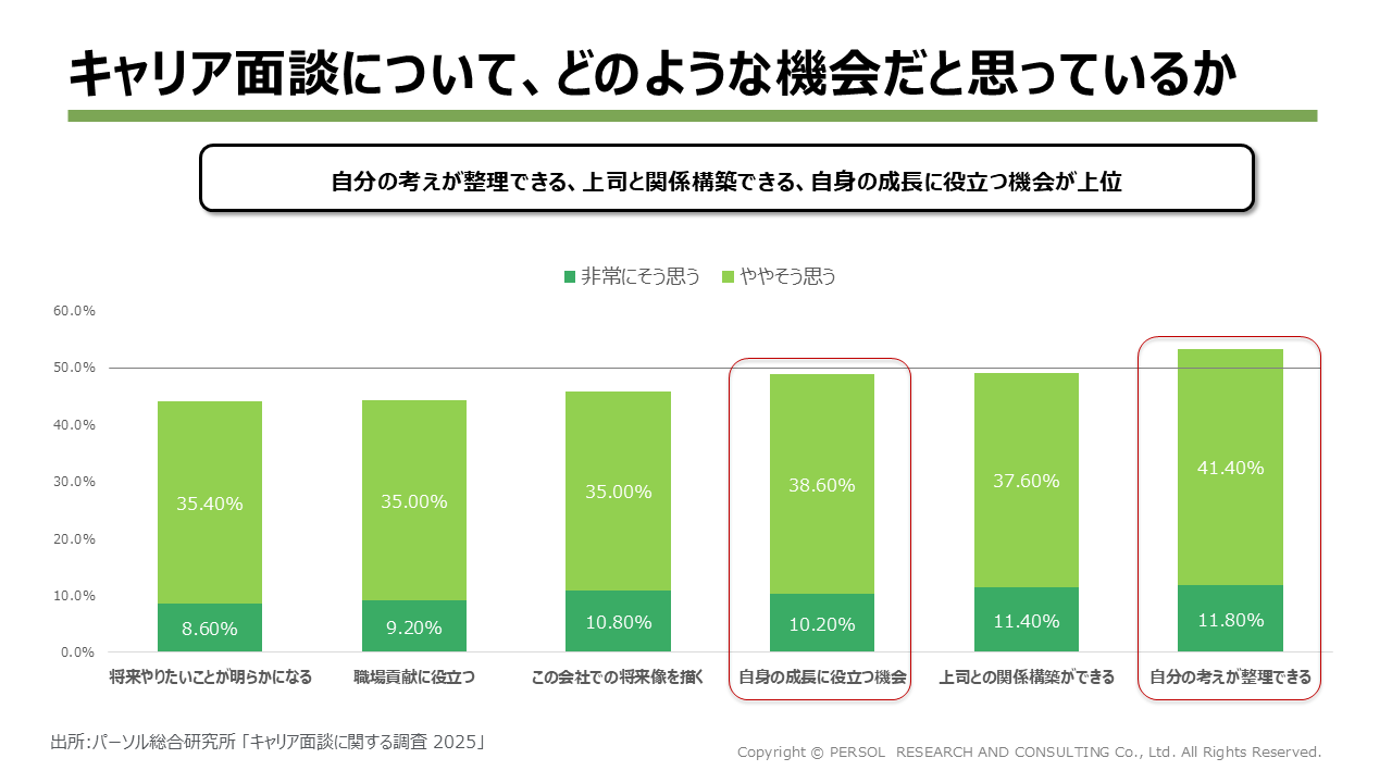 本調査の結果と分析を理解することで、キャリア面談の現況と課題が見えてくる。まずは、キャリア面談とはどのような機会であると部下は思っているのか。2025年の調査では、「自分の考えが整理できる」「上司と関係構築できる」「自身の成長に役立つ」といった、ポジティブな意見が上位となった(図1)。また性別で見ていくと、全体的にポジティブな意見の割合は女性のほうが高く、女性がキャリア面談に対して比較的好意的に捉えていることもわかった。