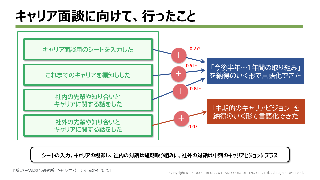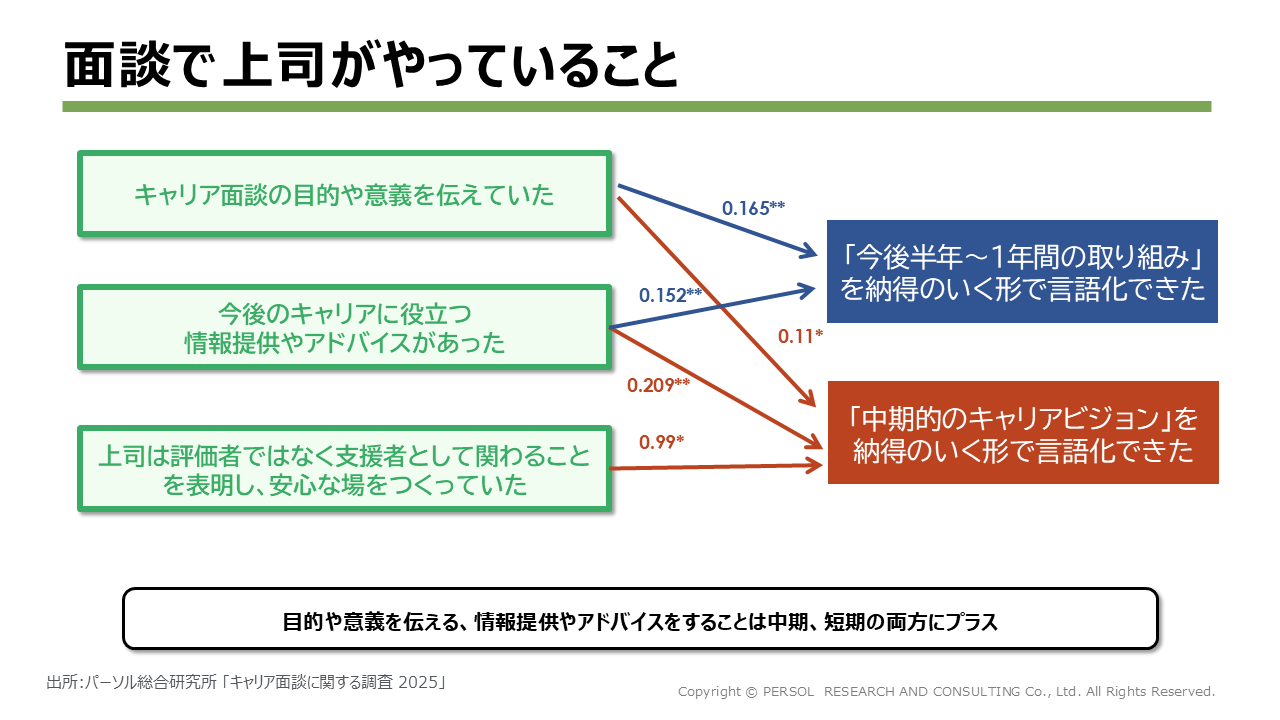 まずは部下の行動について。「キャリア面談に向けて部下が行ったこと」の中で、中期のキャリアビジョンにプラスだったのは、「社外の先輩や知り合いとのキャリアの対話」。短期の取り組みにプラスに影響したのは、「面談シートの入力」「キャリアの棚卸し」「社内の先輩や知り合いとのキャリアの対話」だった(図2)。また、「自分と組織が目指す方向性を重ね合わせることができている」場合、中期と短期の両方にプラスに影響することもわかった。「自分のキャリアビジョンを明確にするだけではなく、組織のパーパスやビジョンと自分とのつながりを考えるといったことに取り組む企業も増えてきています。この点について面談で話し合うのも有効だと思います」(小室氏)