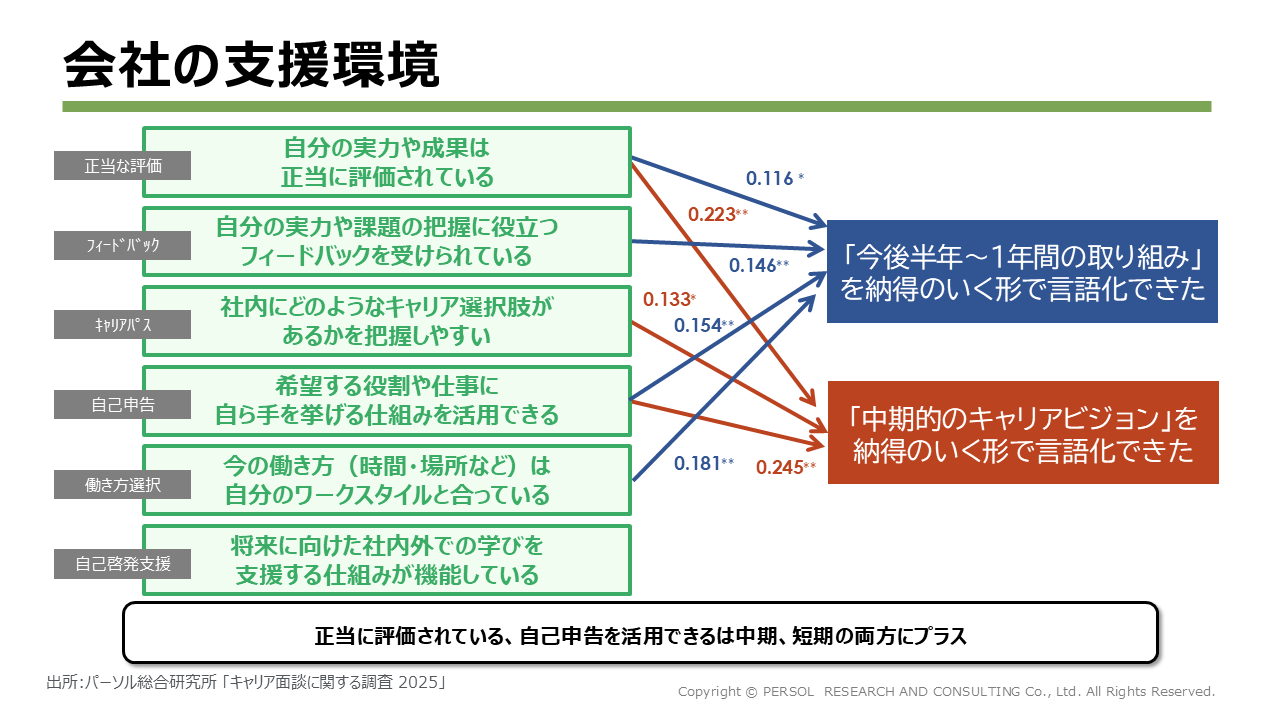 会社の支援環境について、中期・短期の両方にプラスだったのは、「自分の実力や成果は正当に評価されている」「希望する役割や仕事に自ら手を挙げる仕組みを活用できる」だった(図4)。「この会社は自分がキャリアを積んでいくのにふさわしいか?」で選ばれる時代を反映した結果といえるのではないか。