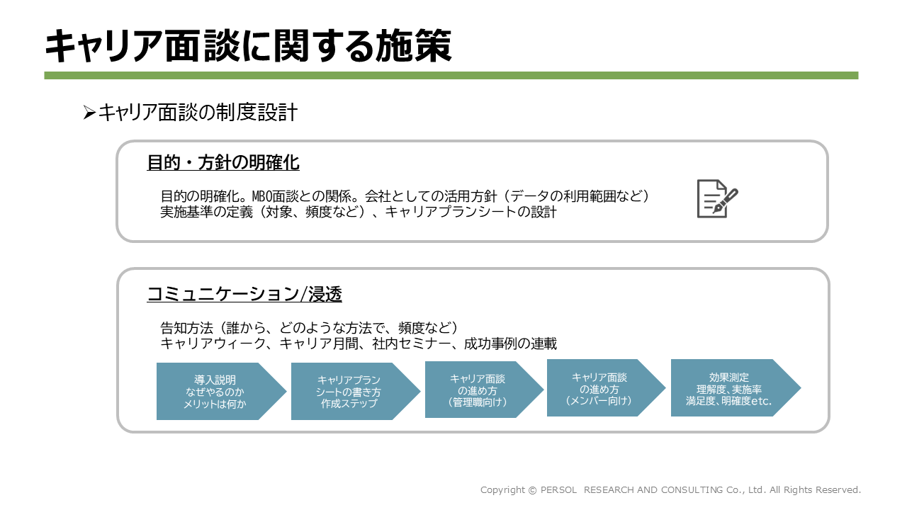 本セミナーのまとめとして、キャリア面談を自社の制度として設計するポイントが示された。最も重要なのが、目的や方針を明確化すること。自社のキャリア面談は何のためにやるのか。MBO面談との違いは何か。面談をもとにタレントマネジメントシステムなどで定量・定性の情報を蓄積していく場合には、何に活用するのかを明確にする。制度の目的に対する共通認識を浸透させるための施策、そして効果測定についても併せて設計しておきたい(図5)。