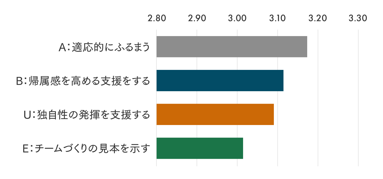 AUBEの4つの要素の平均値で実践度合いをみると、相対的に実践度合が高かったのは「A:適応的にふるまう」、低かったのは「E:チームづくりの見本を示す」でした。状況に応じて行動を調整する行動は実践されている一方で、多様性を活かすチームづくりを率先する行動はやや弱いとメンバーには映っているようです。