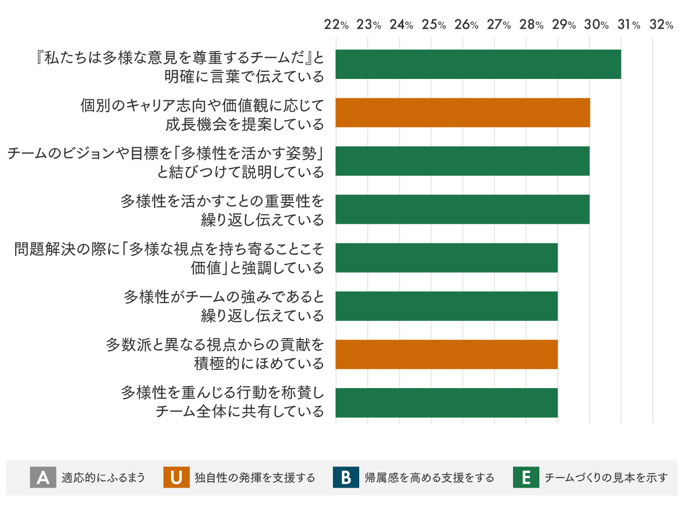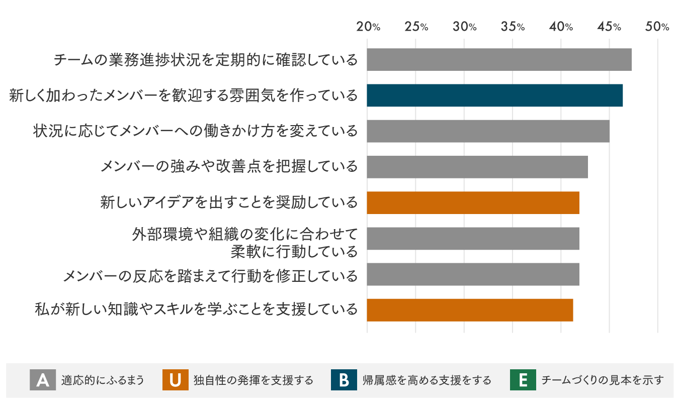 肯定的な回答が多い上位8項目のうち5項目が、「A:適応的にふるまう」に該当しました(図3)。環境変化を捉えた着実な進捗管理や、状況に応じてメンバー一人ひとりへの対応を調整することについて特に実践されている傾向がみられました。また、「B:帰属感を高める支援をする」「U:独自性の発揮を支援する」については、新しく加わったメンバーを歓迎する職場の雰囲気づくり、新しいアイデアの奨励も上位に挙がりました。