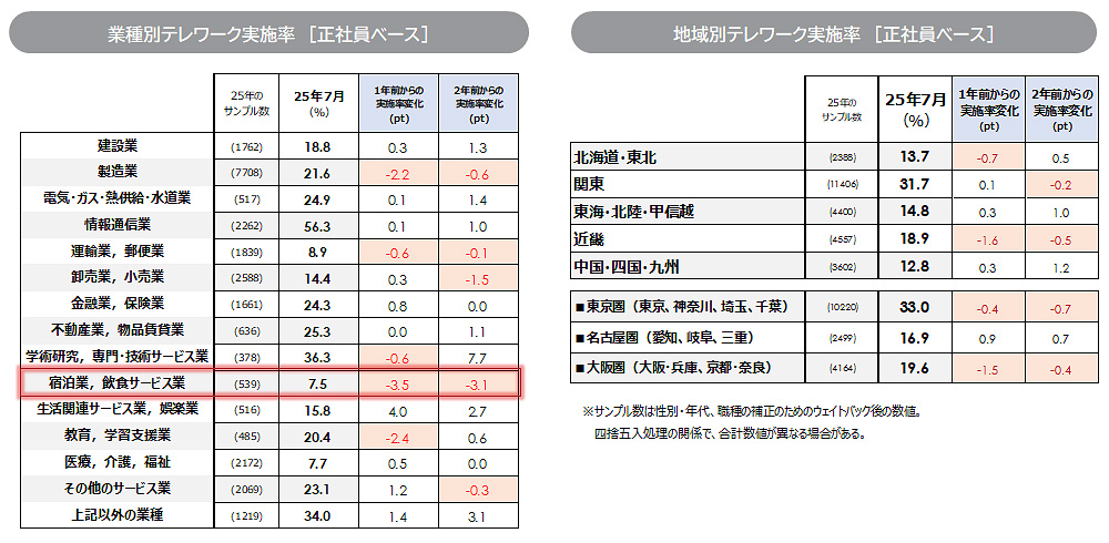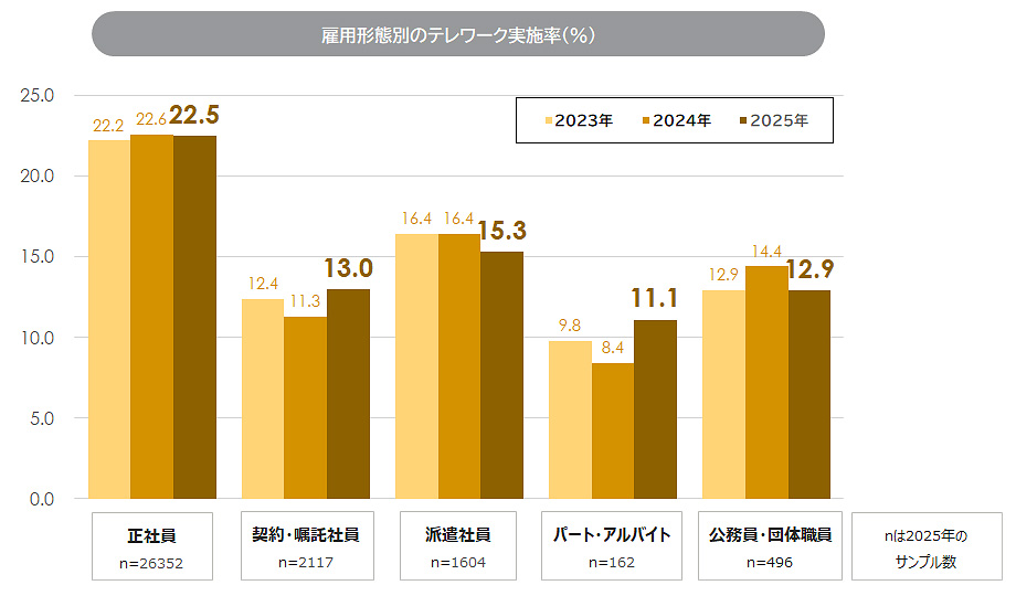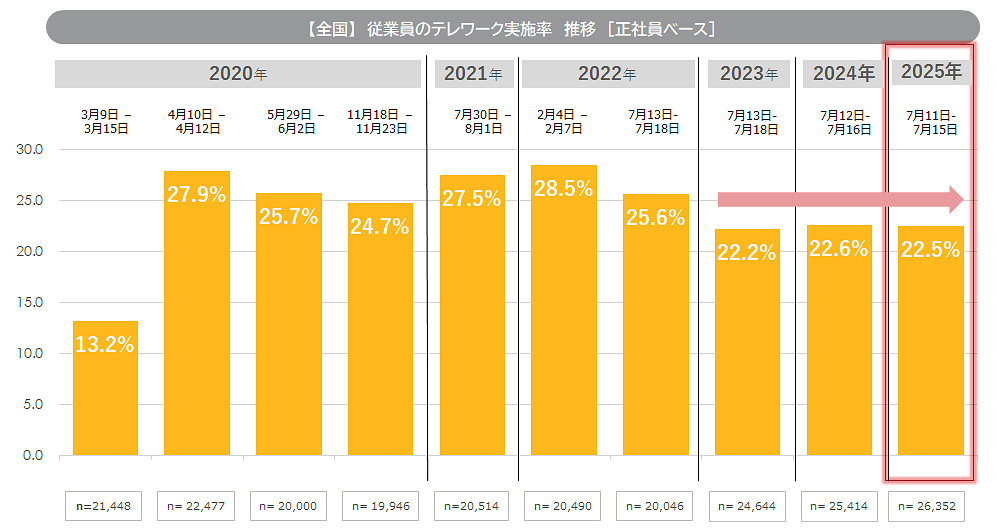 テレワーク実施率は22.5%と、前年とほぼ同水準で推移し、コロナ禍以降の安定的な定着がうかがえます。一方で、「週1日以下」など低頻度のテレワーカーが増加しており、テレワークの実施“頻度”には減少傾向が見られました。