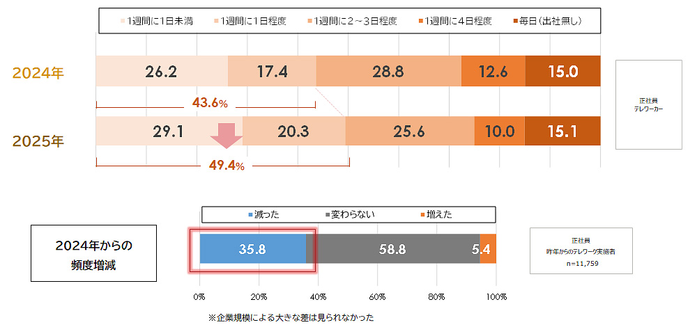 一方で、テレワークの「頻度」に注目するとやや減少傾向が見られる。昨年からの変化を尋ねた設問において、「テレワークの頻度が減った」と回答した人は35.8%にのぼり、増加傾向よりも明確に多い。