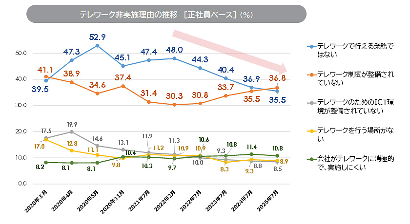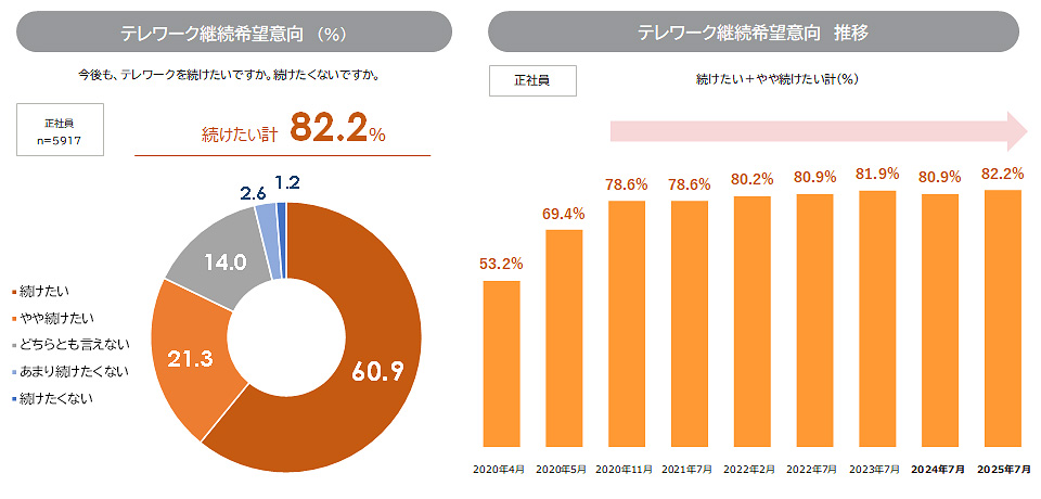 また、テレワーク継続希望者の割合は調査開始以来で最も高い82.2%に達し、従業員側のニーズは依然として高いことが明らかになりました。一方で、「制度未整備」など企業側の対応課題や、「部下の様子が分からない」といったマネジメント上の不安も残存しています。