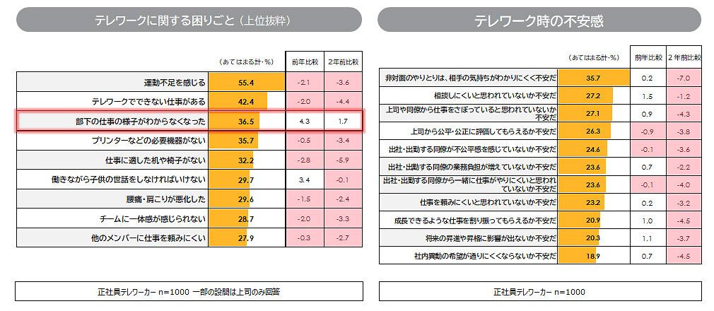 また、テレワークへの慣れが進み、テレワーク時の困りごと(デメリット)は徐々に減少している中、マネジメントに関する課題は依然として解決されていない。上司が部下の仕事の様子が見えないという課題が、テレワーク普及後5年経っても残存している様子がうかがえる。