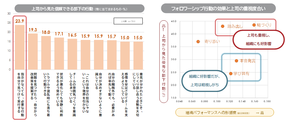 組織成果にプラスの一部フォロワーシップ行動は、上司に見過ごされやすい実態(右図)
