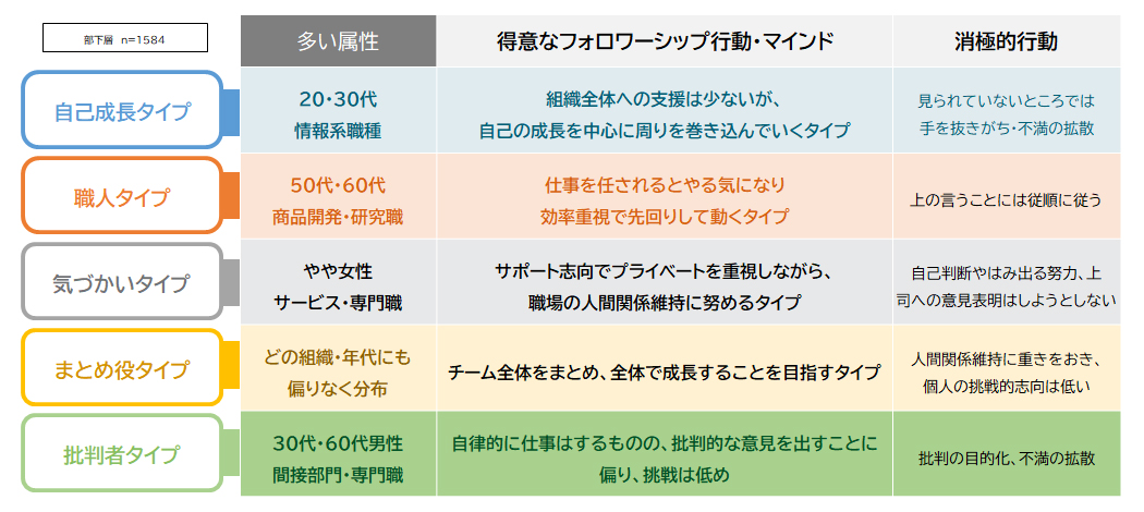 タイプごとに得意な行動・苦手な行動(消極性)が異なる:フォロワーのタイプ別に「多い属性」「フォロワーシップ行動・マインド」「消極性」をまとめた。全体として万能はタイプはおらず、積極的タイプ・消極的タイプのいずれにも、特徴的な得意行動と消極的行動が見られた。