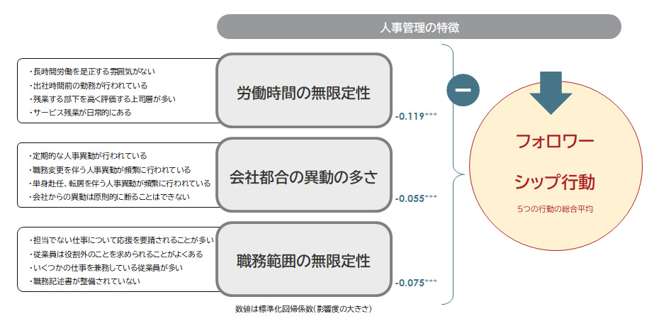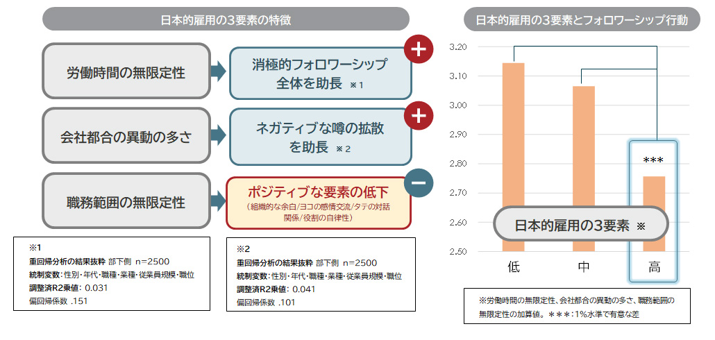 フォロワーシップ行動を縮小させる各人材マネジメント要素について深堀りすると、「労働時間の無限定性」は消極的フォロワーシップ行動全体を助長。「会社都合の異動の多さ」は、ネガティブ拡散行動を助長し、「職務範囲の無限定性」は先述のポジティブな組織要素全体を低下させている。こうしたいわゆる日本的雇用の要素が総合的に高い場合、フォロワーシップ行動全体が縮小している傾向があった。