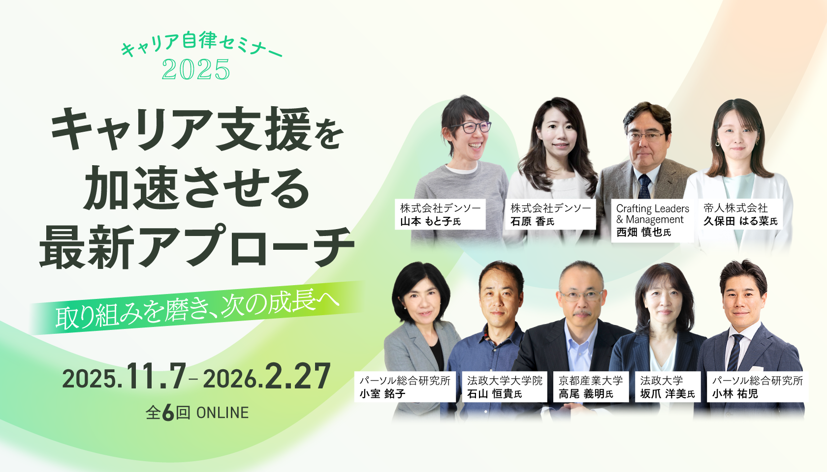 昨今 、人的資本経営を推進するために、多くの企業が「従業員のキャリア自律」を重要視しています。キャリア研修、キャリア面談、キャリアカウンセリング、学びの機会の提供など、様々な取り組みを行っていますが、すべての取り組みに共通する重要な要素は、「支援のあり方」です。今年で5年目を迎えるキャリア自律セミナーは、次の成長へ向けた「さらなる支援の形」を模索します。最新の研究や企業による実践をもとに、取り組みを磨く視点を皆さんと考えます。