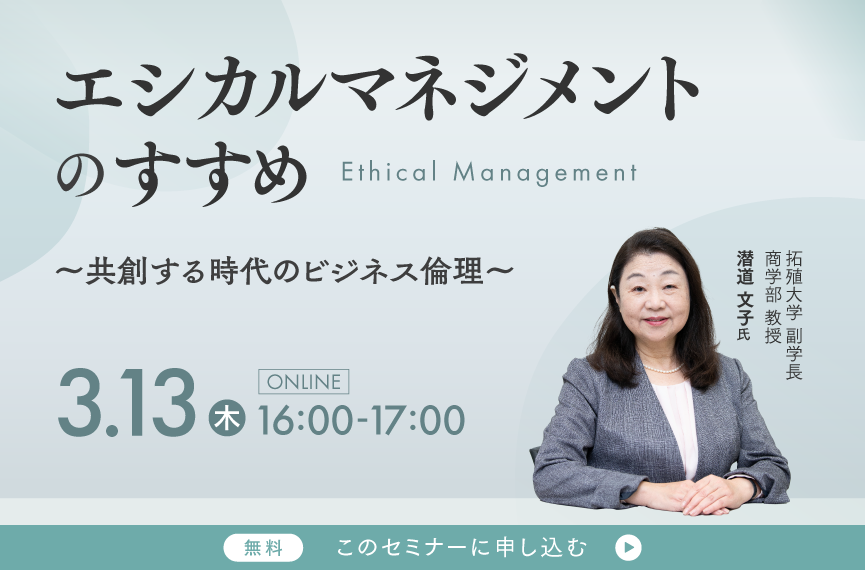 本セミナーでは、ビジネス倫理や企業の社会的責任を推進するリーダーの役割を中心とした「エシカルマネジメント」に焦点を当て、日本経営倫理学会の潜道会長(拓殖大学副学長兼商学部教授)をお招きし、「エシカルマネジメント」や「戦略的CSR」の考え方、そして組織での推進方法についてお話しいただきます。