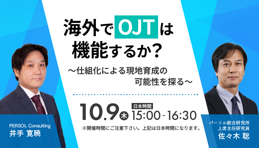 本ウェビナーでは、パーソル総合研究所とPERSOL Consultingが共同で、調査結果や実践事例を交えながら、OJTの現在地や海外拠点での育成のヒントをご提供します。オンライン開催となりますので、日本をはじめとしたアジア各地からのご参加をお待ちしております。