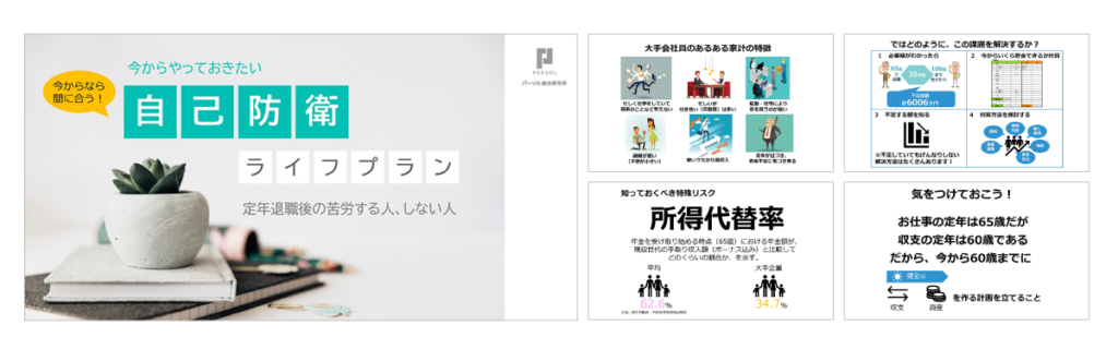 企業で働く方が老後の資産運用について考えるライフプランに関するeラーニングです。現状のまま生活すると、60代を迎えた時にどのような生活になるのか、具体的な数字を提示しながらリアルに「やがて訪れる現実」をイメージしていただきます。老後の生活の中で「お金」にまつわるどのような問題が発生して、どのように改善していけば良いのか、のヒントを学びます。