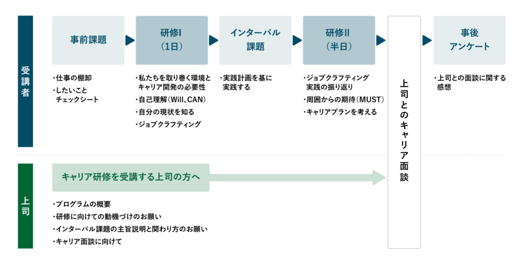 本プログラムでは、2回の研修に加えて、職場でのインターバル課題や上司とのキャリア面談を盛り込み、適切なキャリアとの向き合い方について考える機会を提供します。