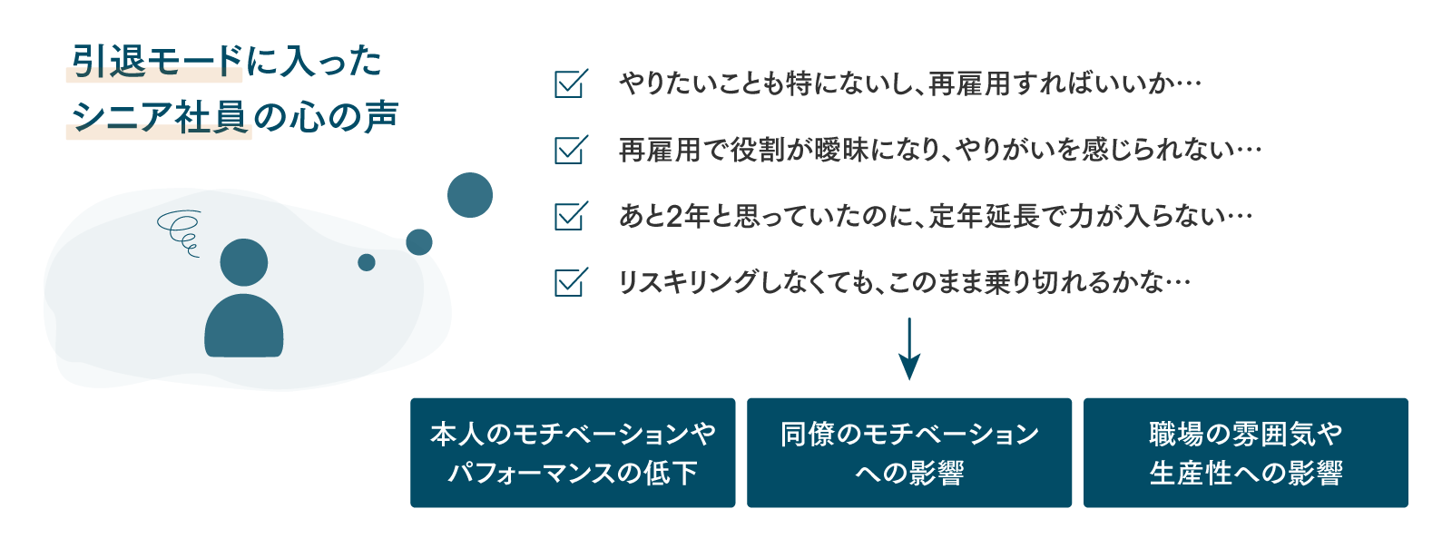 労働力不足の深刻化を背景に、定年退職年齢の引き上げを行う企業が増え、70歳までの就業機会確保を企業の努力義務とする法改正がなされるなど、シニア層の労働参加への期待はますます高まっています。一方、シニア社員は「キャリアの終わり」を感じ、新たな活動に消極的になる、やりがいを見失うなど “引退モード” となってしまう人が少なくありません。シニア層の活躍を促進するためには、これまで培ってきたキャリア資産について整理をし、そのうえで「組織を卒業した後のキャリア」や「自分が望む生き方」、そして「今の組織にいる間にやっておきたいこと」を問い直す機会が必要です。本プログラムは、「サステナブルキャリア」という考え方をベースに、生涯キャリアについて「幸福」「健康」「貢献」の観点から考え、目指す状態に向けて社内外で取り組みたいことを言語化します。