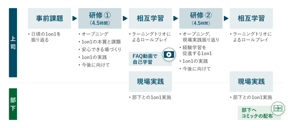 1on1は、上司が一方的に進行するものではなく、上司と部下が協働して即興で創り上げる時間です。1on1を効果的に機能させるためには、上司だけではなく、部下自身も1on1について理解する必要があります。本プログラムでは、1on1の基本的な考え方をわかりやすく漫画でまとめたコミックラーニングを部下に配布し、1on1の理解を促します。