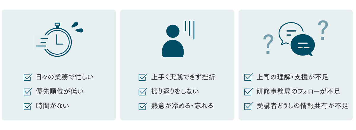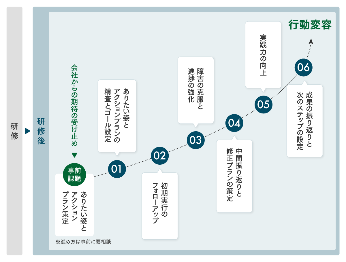 研修実施後、各受講者のありたい姿やアクションプランを基に、個人の状況に応じた行動変容を促します。