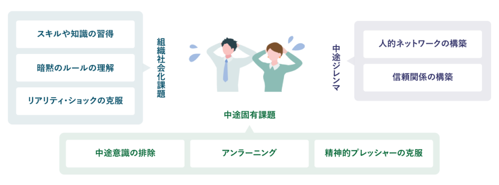 尾形真実哉教授によれば、中途採用者は職場で即戦力として期待される一方で、8つの適応課題を抱えているとされています。これは本人の努力と周囲の支援の両方がなければ解決していくことはできません。中途採用者が本来の力を発揮し、組織に貢献していくためにも、これらの課題を解決していくことが重要です。