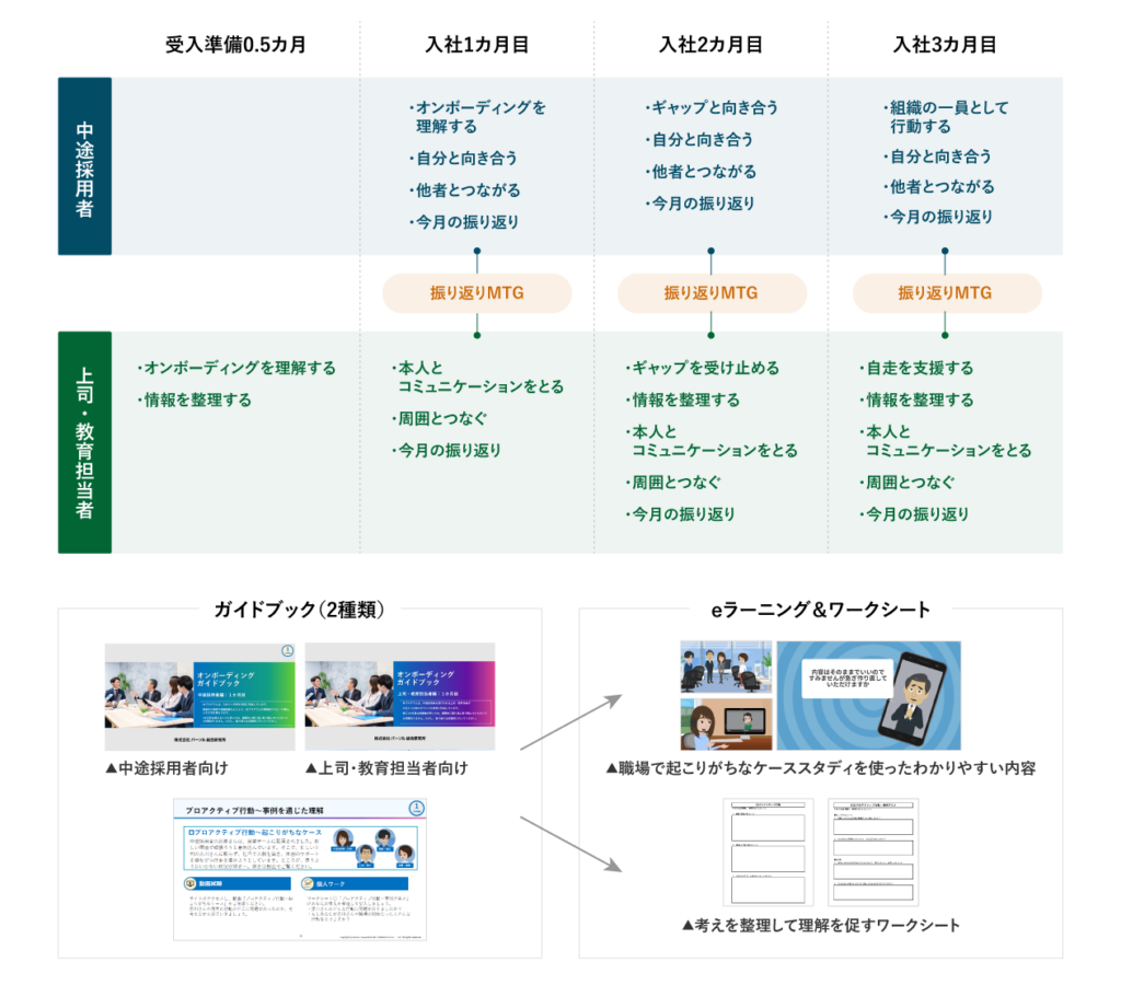 本プログラムは、中途採用者と上司・教育担当者が並行して学習を進めます。ガイドブックやeラーニングにより、中途採用者が直面しやすい課題は何か、課題を乗り越えるためにどのような対策が必要かについて、理解を深めます。さらに現場実践を通じたモニタリングアンケートと振り返りMTGにより、中途採用者の組織適応力を強化していきます。