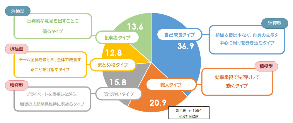 積極的なのは、効率重視で先回りして動く「職人タイプ」、プライベートを重視しながら、職場の人間関係維持に努める「気づかいタイプ」、チーム全体をまとめ、全体で成長することを目指す「まとめ役タイプ」。