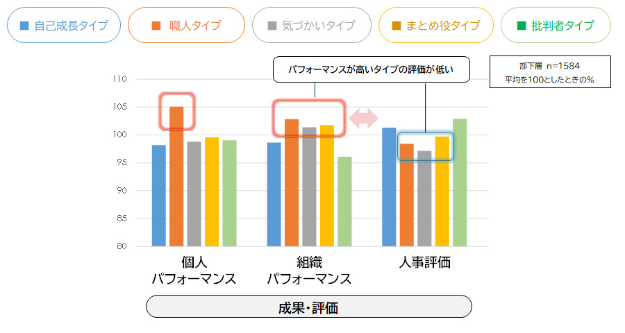 フォロワー(部下)のタイプ別に、個人・組織のパフォーマンスや人事評価などの成果指標の違いを見た。組織パフォーマンスが高い「職人」「気づかい」「まとめ役」タイプは人事評価が低めで、組織パフォーマンスが低めの「自己成長」「批判者」タイプは人事評価が高いという逆転した関係がみられる。「職人」タイプは、他のタイプよりも個人パフォーマンスが高い。