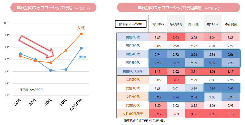 フォロワーシップ行動の性年代別の特徴を見た。男女ともに20代から40代にかけてフォロワーシップ行動全体が減少していく。男女ともに60代の行動全体がかなり高い傾向にあるが、本調査は、正規雇用社員を対象としており、一般的な60歳以上の中でもそもそも意欲や能力の高いメンバーが多く含まれている可能性がある。