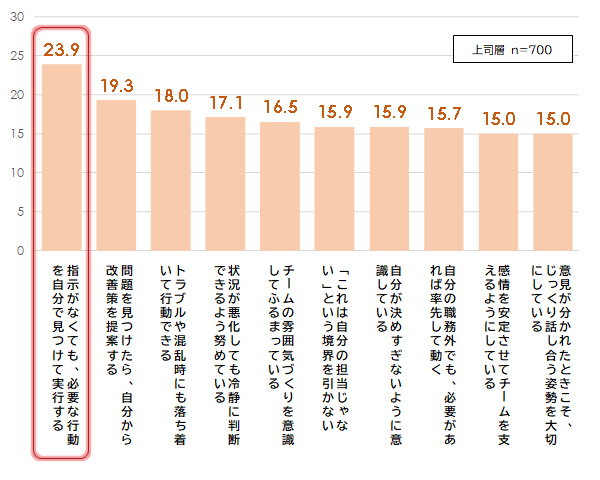 上司から見た信頼できるフォロワー(部下)の行動を聴取した。「指示がなくても、必要な行動を自分で見つけて実行する(23.9%)」が最上位。以下、「問題を見つけたら、自分から改善策を提案する(19.3%)」「トラブルや混乱時にも落ち着いて行動できる(18.0%)」が続く。上司層は、主にフォロワーの先回り行動と冷静な業務判断を重視している傾向がみられる。