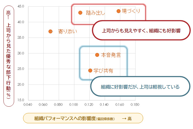 組織のパフォーマンスにつながっているフォロワーシップ行動を分析した。フォロワーシップ行動の中でも、チームを円滑に回す「場づくり」行動、建設的に意見を言う「本音発言」行動、 経験を集合知に変える「学び共有」行動、 チームの感情を支える「寄り添い」行動、 役割にとらわれず動く「踏み出し」行動の5つの行動が、組織のパフォーマンスにプラスの影響が見られた。