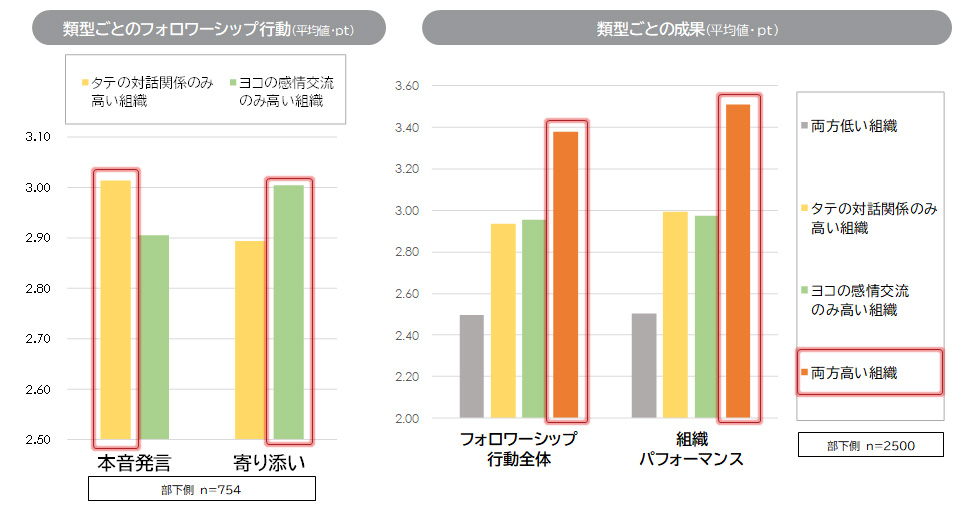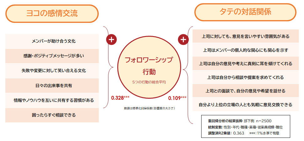 組織のパフォーマンスにつながるフォロワーシップ行動に良い影響を与えるコミュニケーションの要素を分析した。ひとつは、チームメンバーや同僚同士の水平的な関係において、感謝や笑いといった感情レベルの交流があること(ヨコの感情交流)。もうひとつは、上司や上位層に対する意見の言いやすさ、風通しの良さ(タテの対話関係)の重要性が示された。