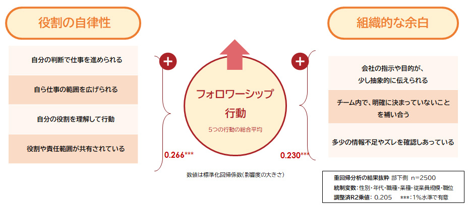 組織のパフォーマンスにつながるフォロワーシップ行動に紐づいている組織の特徴を見た。自分の判断で仕事を進められるなど、個人の「役割の自律性」が高いほど、そして、チーム内で、明確に決まっていないことを補い合うなど、組織からの指示に現場で埋められる余白(「組織的な余白」)があるほど、フォロワーシップ行動にプラスの影響が見られた。