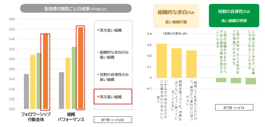「役割の自律性のみ高い組織」は、「人の目があるときだけ、仕事に力を入れることがある」「上司の決定は、たとえ非効率でも尊重されるべきだ」など、上司の目線を気にした行動がややでやすい傾向にある。「組織的な余白のみが高い組織」は、「できるだけ労力をかけずに仕事を終わらせたいと思う」「問題を見つけても、波風を立てないように黙っていることが多い」など、必要以上の労力をかけず、建設的意見がでにくい傾向にある。
